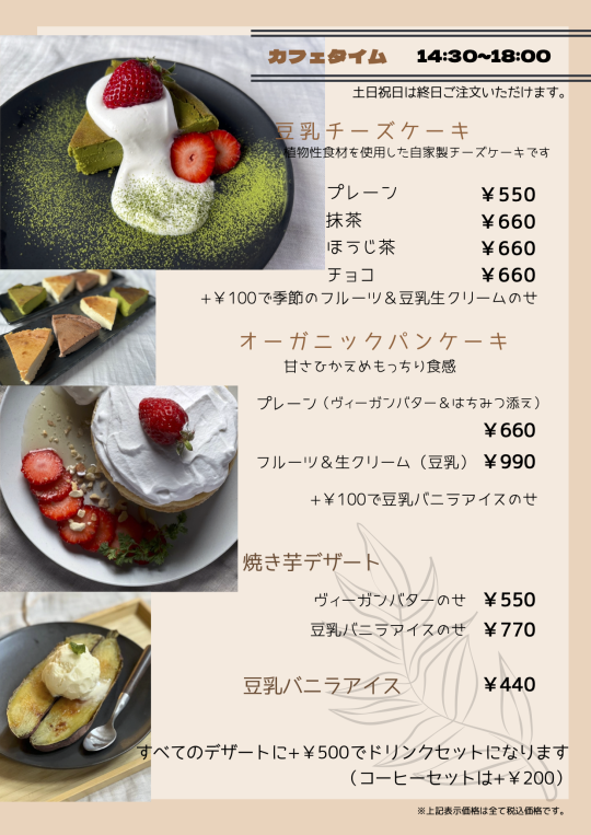- 豆乳チーズケーキ(抹茶・ほうじ茶・チョコ)